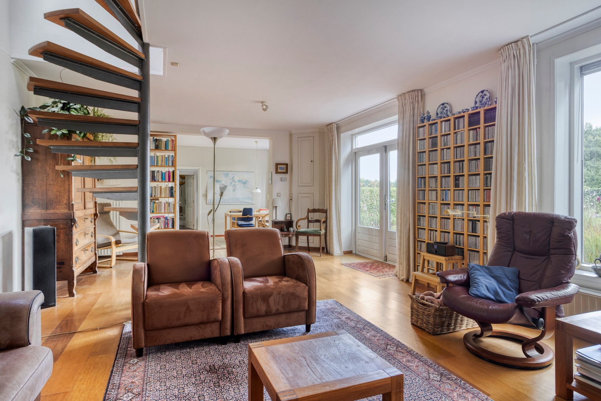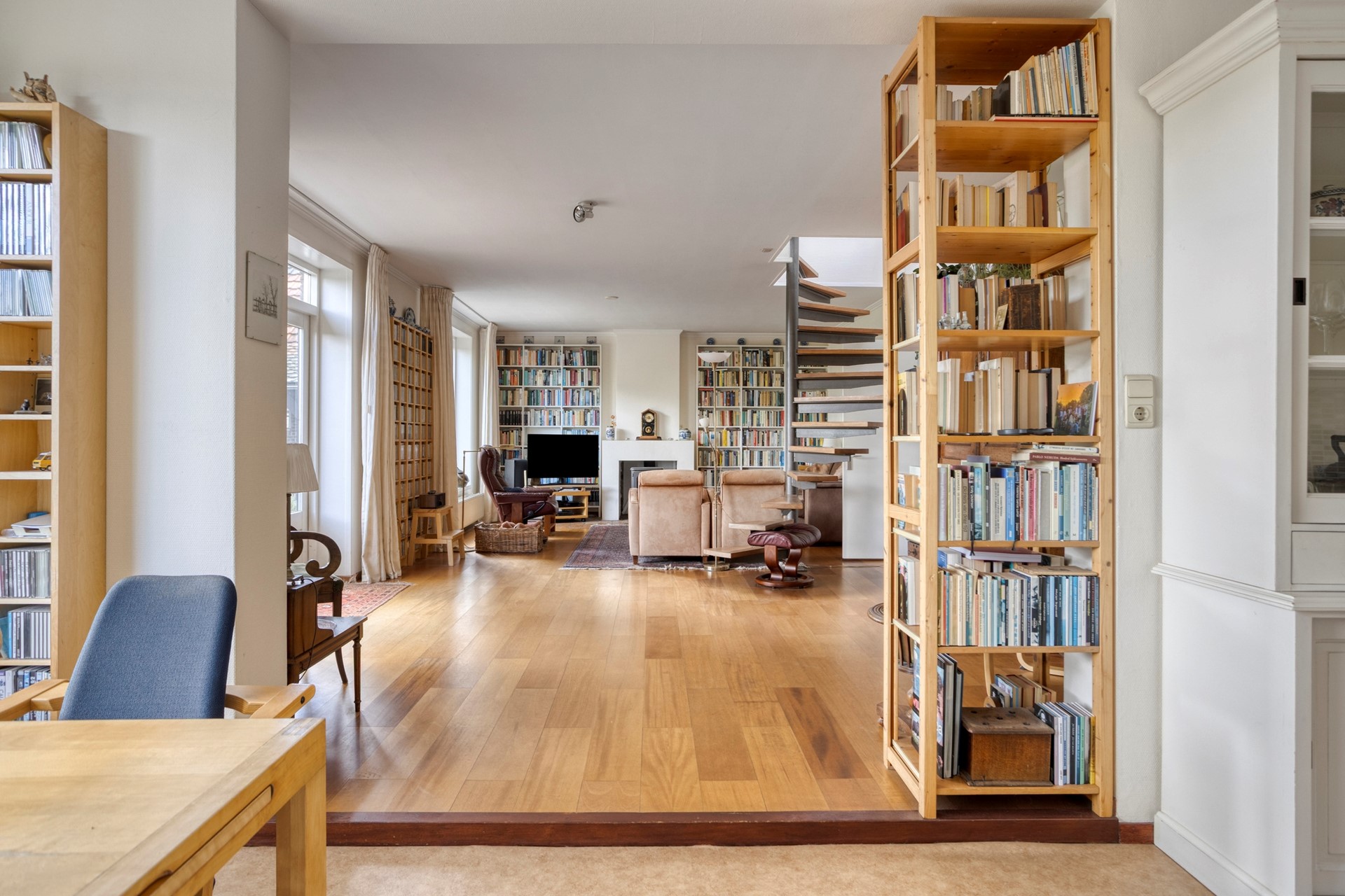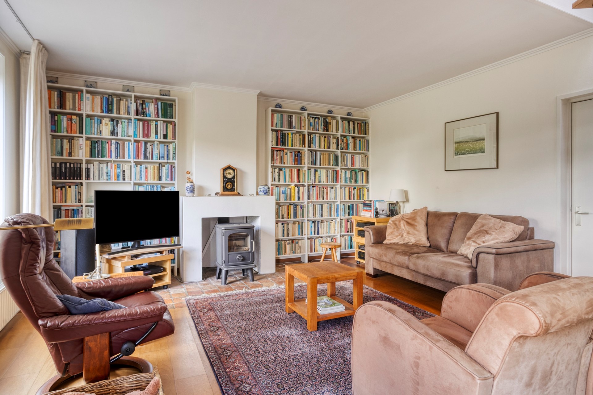 Gelijkvloers: Sfeervolle living met parketvloer en een gezellige houtkachel, aangrenzende werkkamer of extra slaapkamer.
