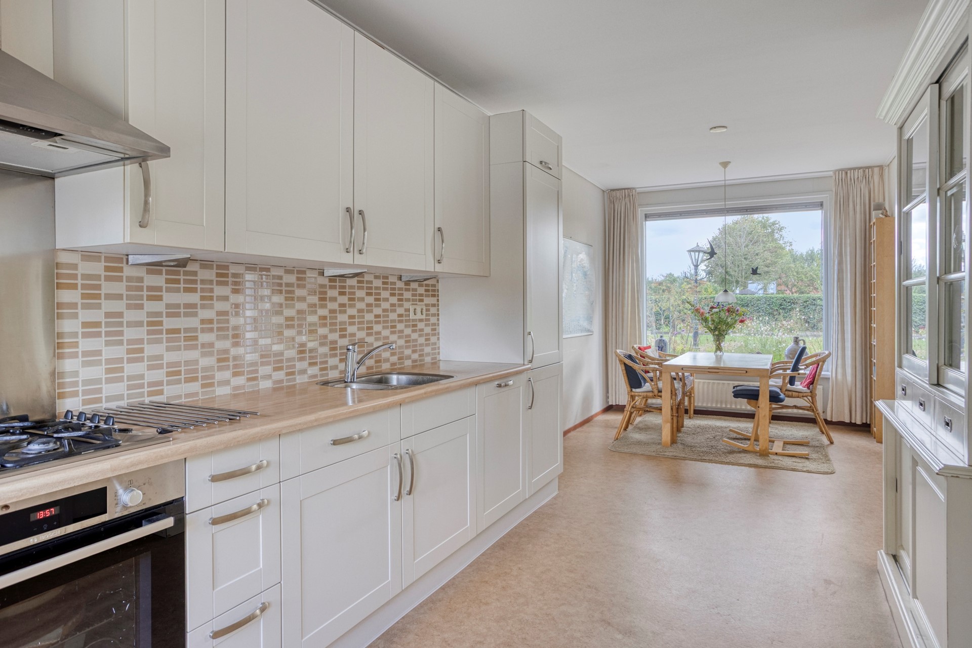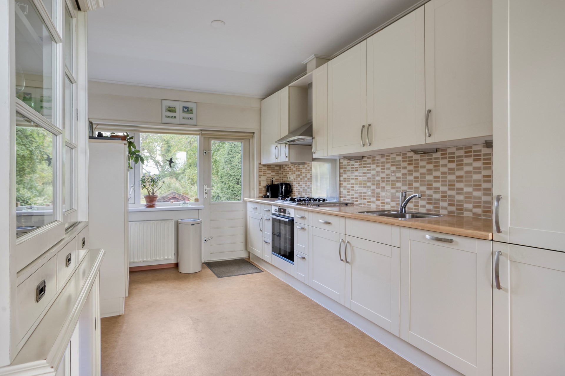 Lichte keuken met zicht op de tuin en toegang tot de ruime bijkeuken met aansluiting voor wasmachine en droger. Bovendien is er veel kastruimte.