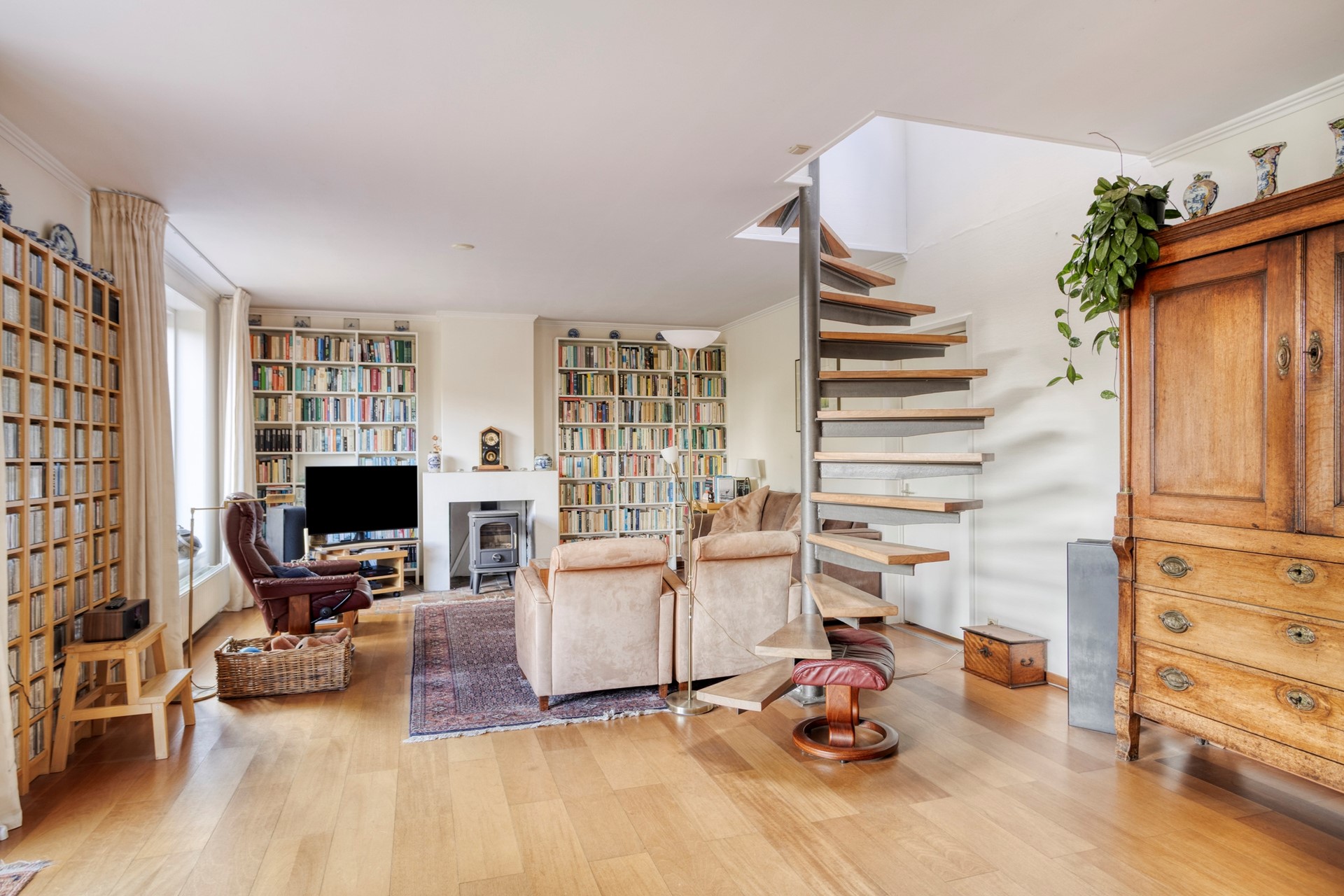 Gezellige houtkachel en warme parketvloer in de living.