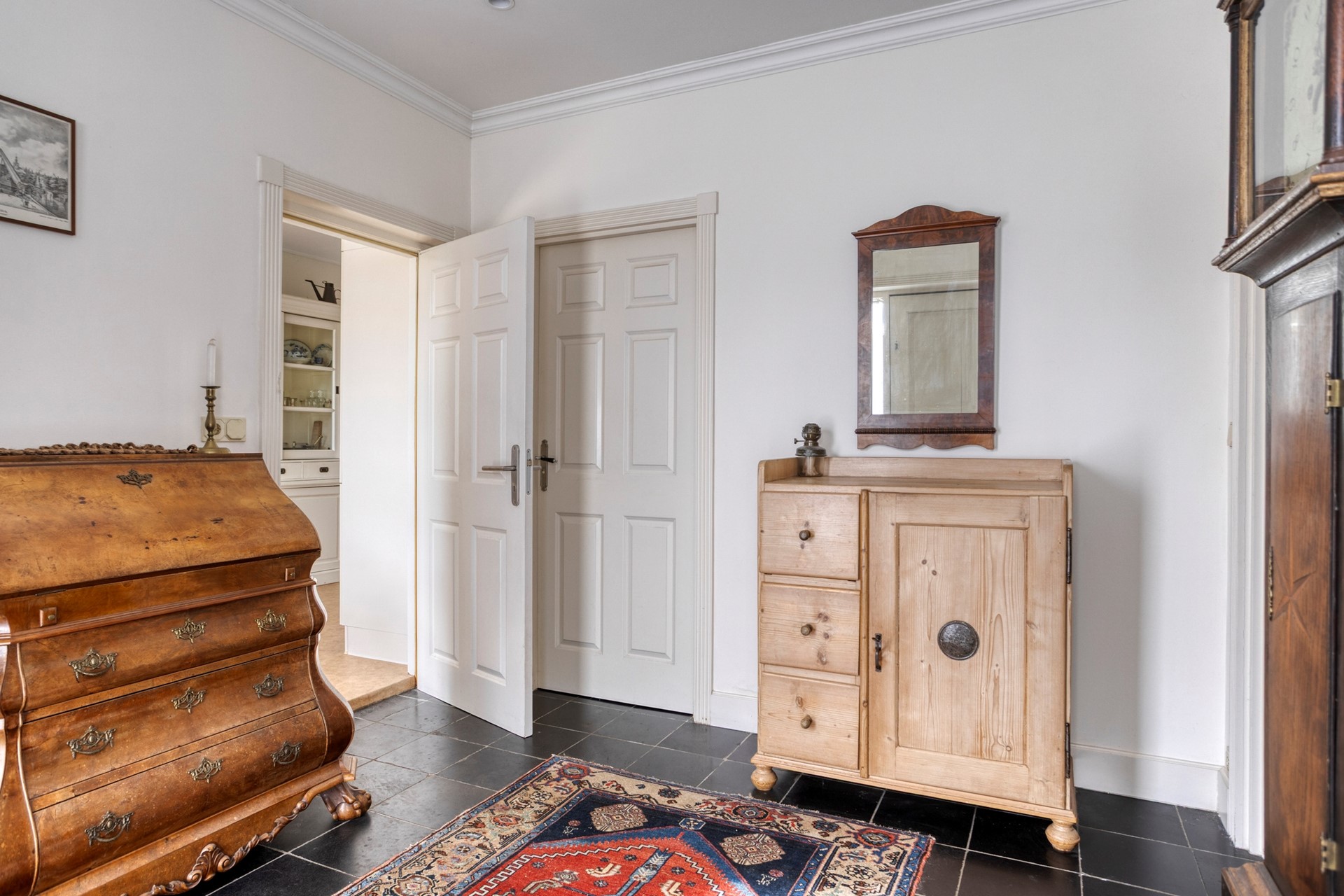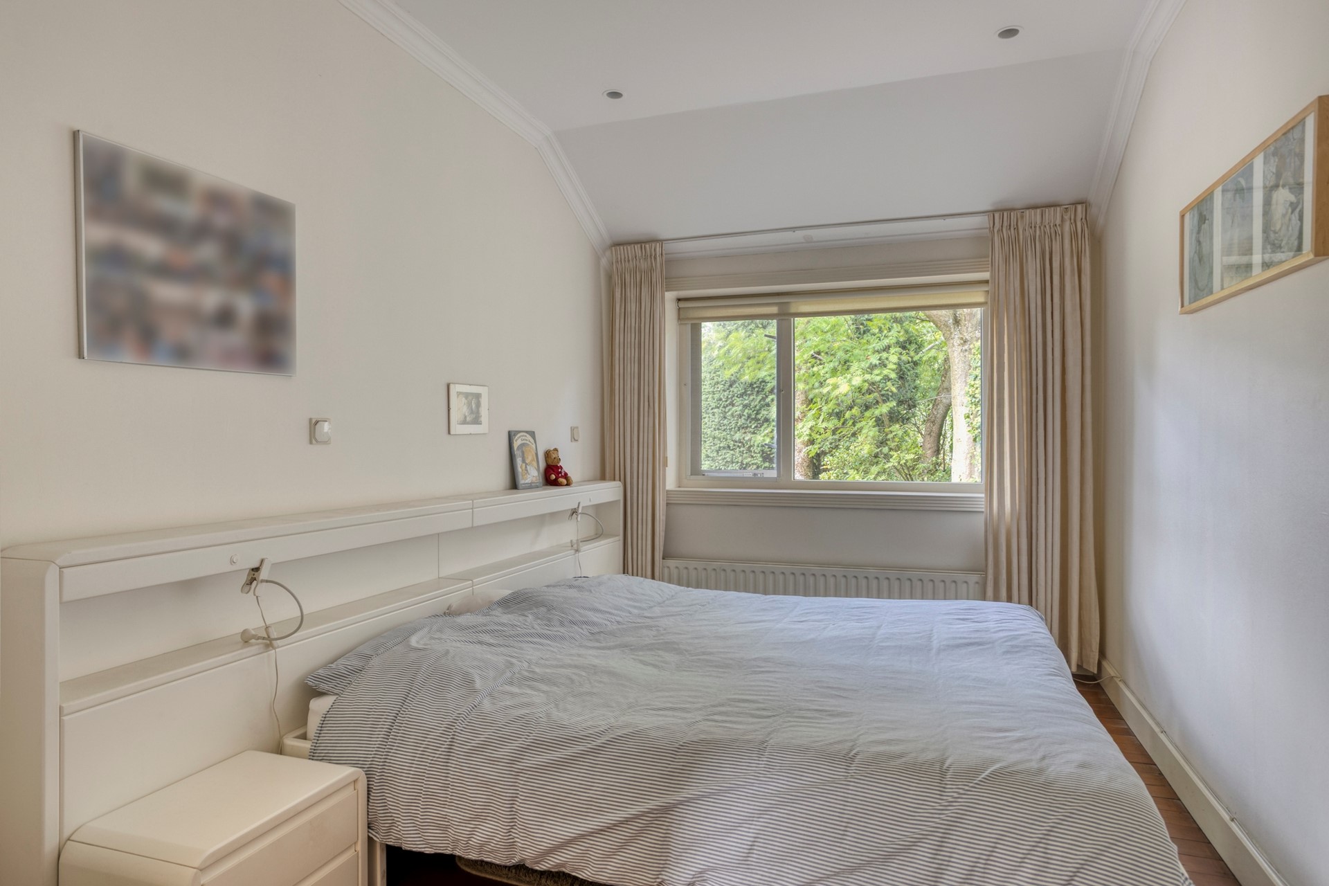Slaapkamer op de begane grond met eigen badkamer – handig voor wie levenslang gelijkvloers wil wonen. Er zijn ruime inbouwkasten. Hierboven heeft u een ruime bergzolder, bereikbaar met een vlizotrap.