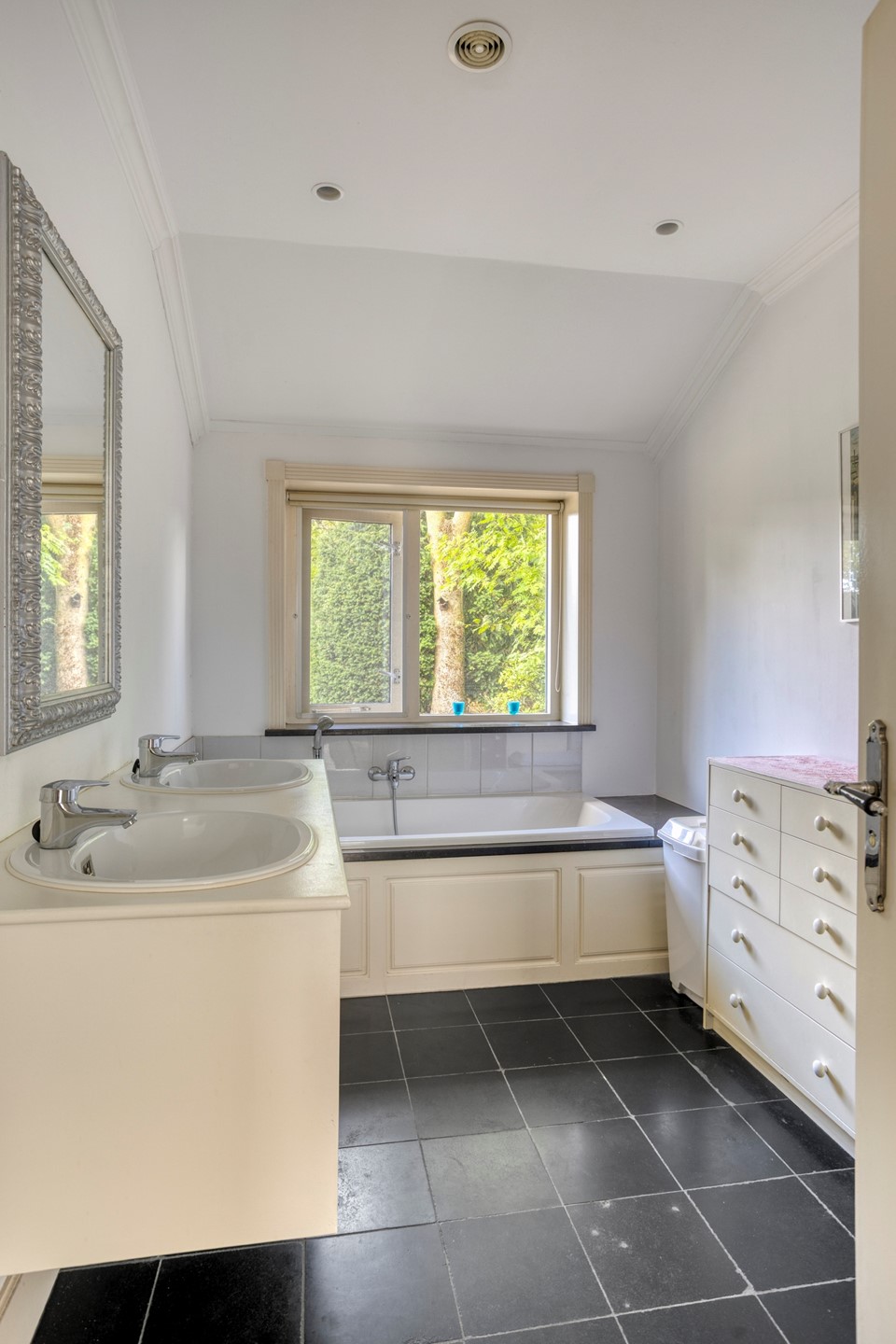 Badkamer met dubbele wastafel, ligbad en douche .
