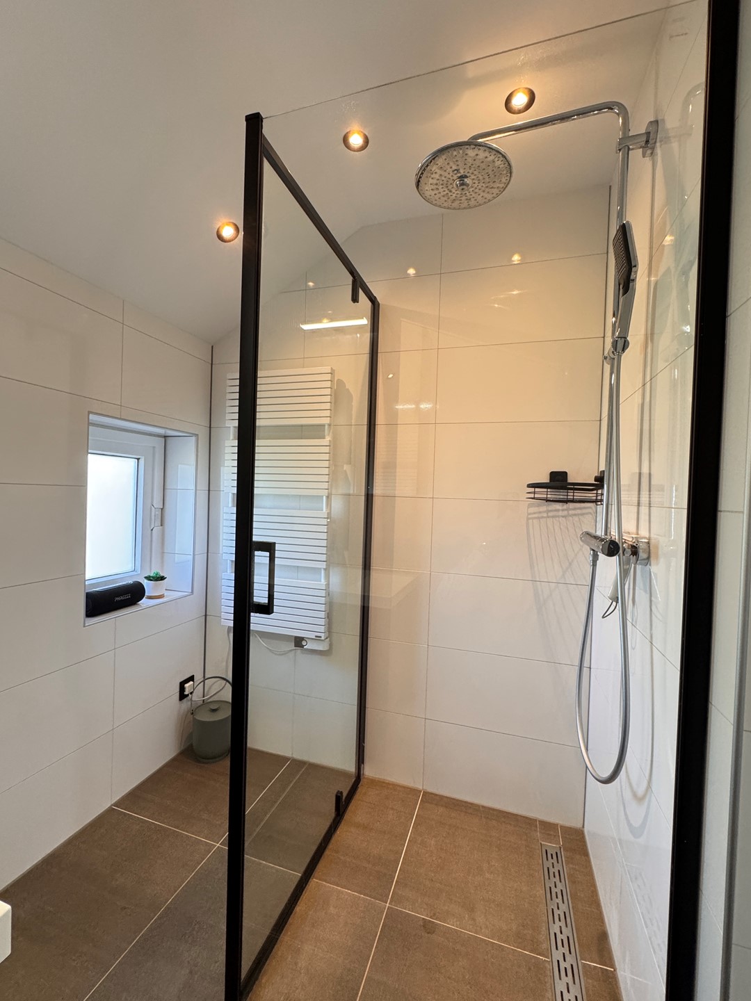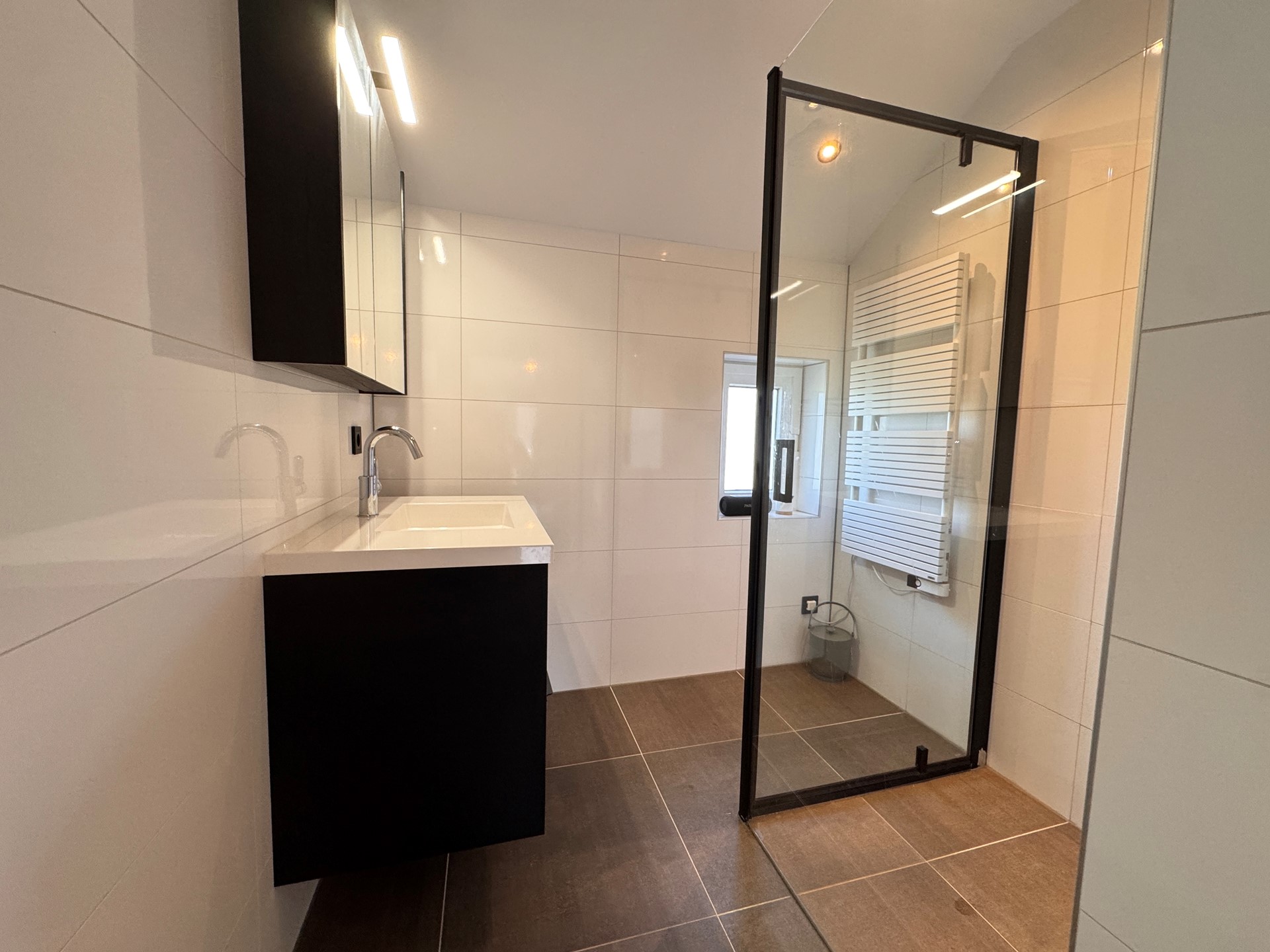 De woning beschikt over drie slaapkamers, perfect voor een gezin of om een thuiswerkplek te creëren. De badkamer is modern uitgevoerd met een stijlvol wastafelmeubel en een inloopdouche met glazen wand.