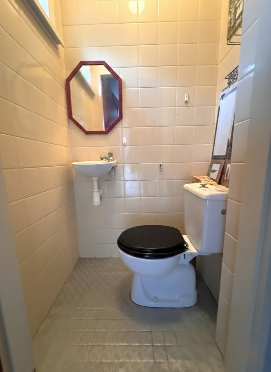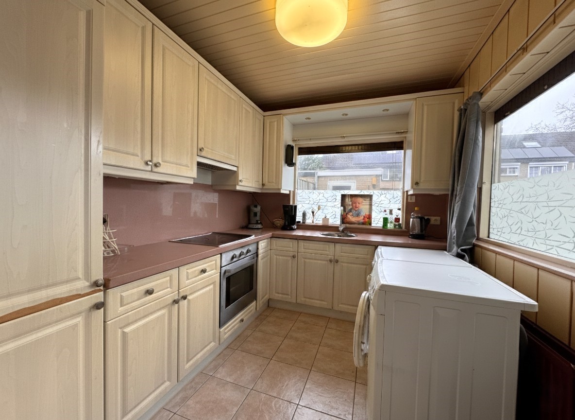 De keuken bevindt zich in de uitbouw aan de achterzijde. Deze uitbouw is verzakt en de kozijnen dienen hier nog vervangen te worden. Toilet, badkamer en keuken zijn gedateerd, wat de nieuwe eigenaar de kans geeft om alles volledig naar eigen smaak te moderniseren.
